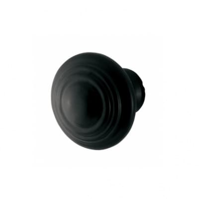 Meubelknop gemaakt van zwart smeedijzer. Het smeedijzer is gemaakt van gesmolten staal en daarna afgewerkt met een zwart licht glimmende poedercoating.