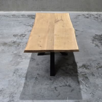 Het blad is gemaakt van oude eiken boomstamplanken en is 5 cm dik. Het is afgewerkt met een matte transparante hardwaxolie (Ciranova Woodlook) waardoor het goed beschermd is tegen vuil en vocht, maar toch het originele karakter behoudt! Deze tafel wordt geleverd met een zwart stalen matrixpoot.