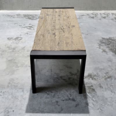 Tafel van oude eiken wagonplanken in 'The Frame'