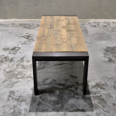 Deze tafel heeft een blad van oude wagonplanken en een zwart stalen onderstel genaamd 'The Frame'. De oude eiken planken komen uit treinwagons uit Frankrijk en hebben door heel Europa gereisd. Hierbij heeft het hout heel wat moeten doorstaan en dat zie je! Het blad is afgewerkt met een matte transparante hardwaxolie waardoor het goed beschermd is tegen vuil en vocht. Hou er wel rekening mee dat het oppervlakte van dit blad ruw is en dus wat lastiger af te nemen met een doek en dat je op moet letten met kleding. Deze kunnen namelijk wat blijven haken.