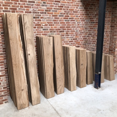 Deze wandplanken van oud eiken boomstamdelen worden aan 3 zijdes strak gezaagd en de voorzijde heeft een geleefde rand. lengte is 120 cm en diepte circa 20-23 cm.