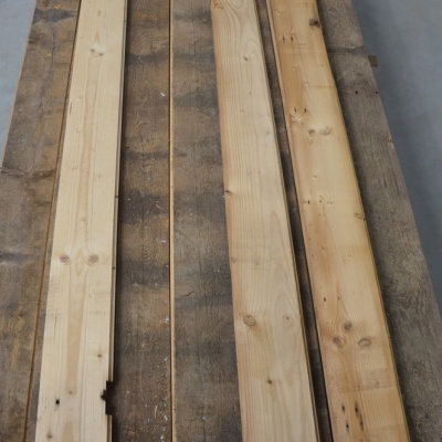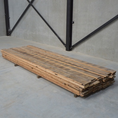 Deze planken worden gezaagd uit oude balken die Destijdsch uit oude sloopwerken haalt. De balken worden ontspijkerd en vervolgens gezaagd tot planken. Aan de lange zijdes zit een mes en groef. In feite zijn het dus nieuwe planken geworden, maar met het karakter van een oude plank. Zo zie je her en der spijkergaatjes en mooie scheurtjes. De planken zijn eenvoudig te leggen in een vloer of te gebruiken als wand of plafond.