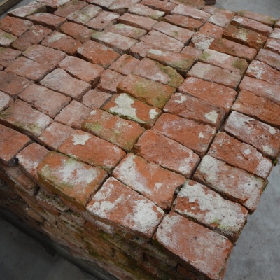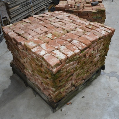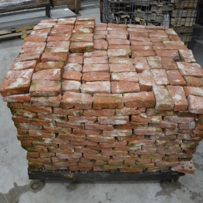 Stuk voor stuk met de hand schoongebikt en geselecteerd op de juiste kwaliteit. Het is een partij van 1100 stenen waarvan er een aantal minder goed zijn. Deze zijn te gebruiken voor het vuilwerk.