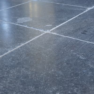 De zijkanten van deze tegels zijn licht verouderd en het oppervlak  van de natuurstenen vloer is daardoor is fijn gewolkt. Doordat de tegels zijn verzoet waarbij de tegels met een diamant wordt bewerkt, kleurt het oppervlak diepblauw waardoor diverse aspecten zoals bijennesten en aders in de steen meer geaccentueerd worden. Prijs is per vierkante meter. Deze tegels zijn geschikt voor vloerverwarming en zeer onderhoudsvriendelijk. De dikte van de tegel is 2 cm.